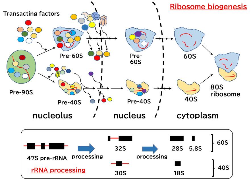 細胞内におけるリボソームの組み立ては、核小体で47S rRNAが転写されることで開始されます。47S rRNAにRNAプロセシングや複合体形成に必要な因子が結合し、90S 前駆体リボソームが形成されます。90S 前駆体リボソームは60S前駆体リボソームサブユニットと40S前駆体リボソームサブユニットに分割されて成熟が行われ、成熟体となり結合され80Sリボソームが形成されます。(大島 廉太)