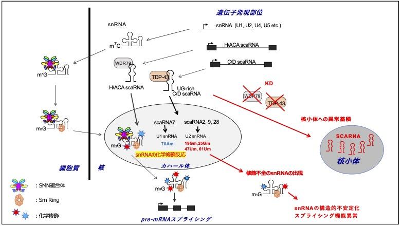 ここでWDR79 やTDP-43の何らかの異常により、SCARNAが適切にカハール体に輸送されなくなった場合、U snRNAは正確な化学修飾を受けることができず、未完成のままスプライセオソームで使用されることが分かっています。未完成のU snRNAは安定性が失われ分解されやすくなったり、本来スプライシングされるべきpre-mRNAのスプライシングが起きないなど、細胞レベルでの遺伝子発現パターン(トランスクリプトーム)に対する問題に発展することが分かっています。