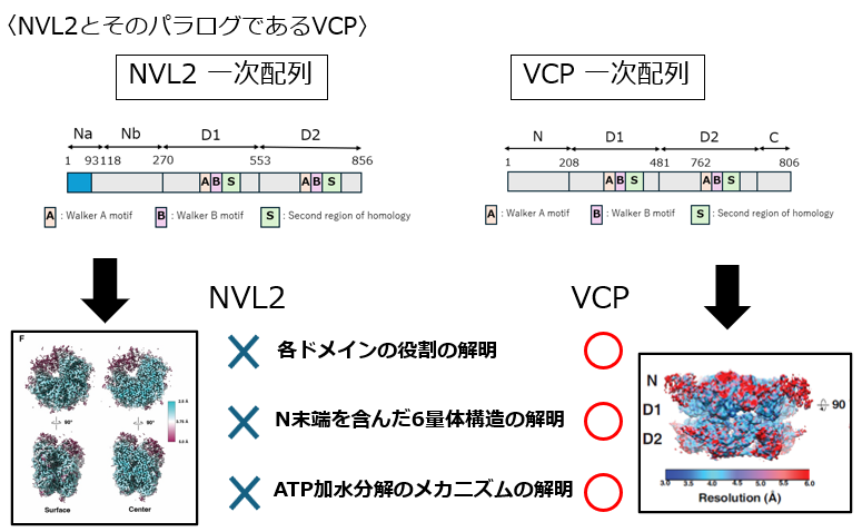 NVL2のパラログであり阻害剤が多く開発されているVCPについては各ドメインの役割やN末端を含んだ詳細な6量体構造等が明らかになっているが、NVL2についてはD1/D2リングを含んだ6量体構造以外はほとんど明らかとなっていない。長浜研では、NVL2の阻害剤の開発に向け、NVL2の立体構造解析および、各ドメインの役割やATP加水分解の詳細なメカニズムについても解析を進めている。(上村涼介)