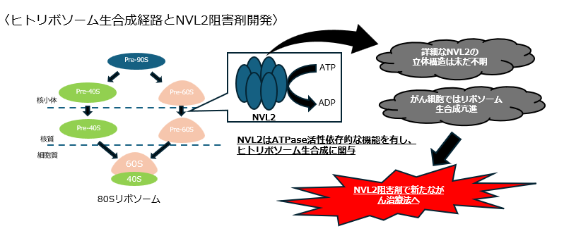 ヒトリボソーム生合成因子のひとつであるNVL2の詳細な立体構造は未だ明らかになっておらず、がん治療の標的となる可能性を秘めているが、NVL2の阻害剤の報告も少数である。